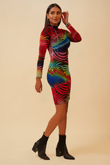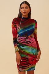 GLOW RIGHT VELVET BODYCON MIDI DRESS - RED/MULTI